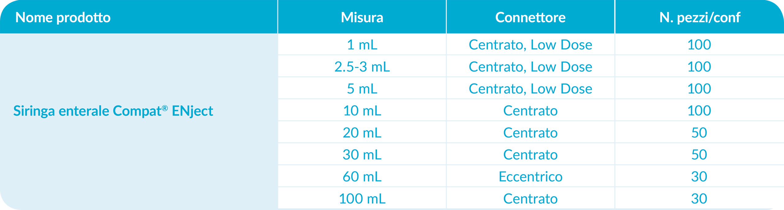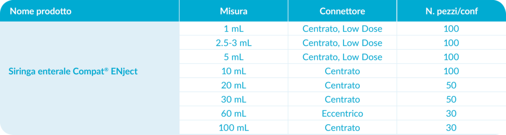 Le siringhe Compat ENject sono disponibili in 8 formati, da 1 mL a 100 mL.